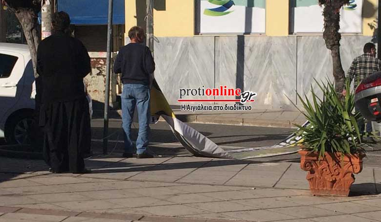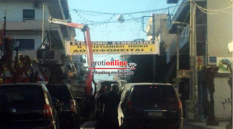 Λίγες ώρες μετά την απόφαση του Μητροπολίτη Καλαβρύτων και Αιγιαλείας Αμβρόσιου, να χτυπούν πένθιμα οι καμπάνες σε περίπτωση που ψηφιστεί το επίμαχο νομοσχέδιο, ανήρτησε σε κεντρικούς δρόμους του Αιγίου πανό που κάνουν λόγο για «δολοφονία» της «χριστιανικής ηθικής».