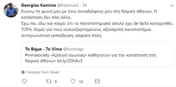 «Ενώνω τη φωνή με τους συναδέλφους μου στη Νομική Αθηνών. Η κατάσταση δεν πάει άλλο. Έχω πει εδώ και καιρό ότι το πανεπιστημιακό άσυλο έχει de facto καταργηθεί. ΤΩΡΑ, δομές για τους ουσιοεξαρτημένους, αξιοπρεπή πανεπιστήμια, ανταγωνιστική εκπαίδευση, ασφαλή πόλη», έγραψε ο κ. Καμίνης.
