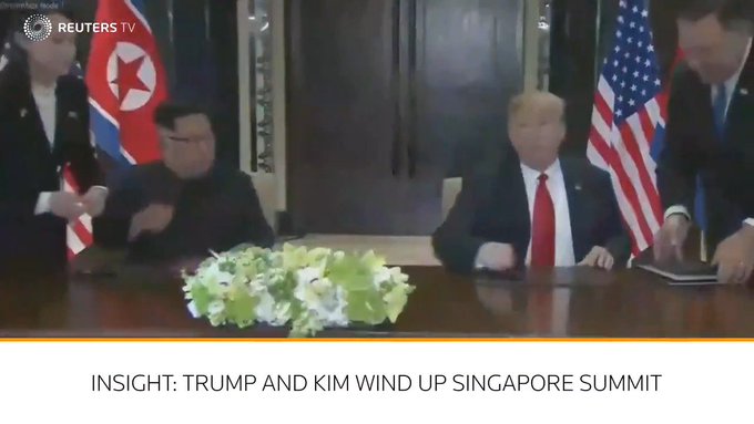 Ο πρόεδρος Ντόναλντ Τραμπ των Ηνωμένων Πολιτειών και ο πρόεδρος Κιμ Γιονγκ-Ουν της Επιτροπής Κρατικών Υποθέσεων της Λαϊκής Δμοκρατίας της Κορέας δεσμεύθηκαν να συνεργασθούν για την ανάπτυξη νέων σχέσεων ανάμεσα στις ΗΠΑ και την ΛΔ της Κορέας και για την προώθηση της ειρήνης, της ευημερίας και της ασφάλειας στην Κορεατική Χερσόνησο και τον κόσμο.