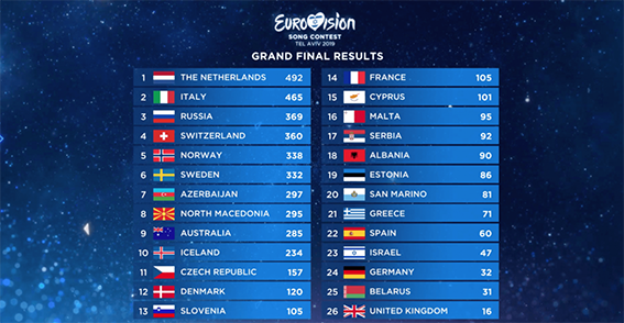 Τη δεύτερη θέση κατέλαβε η Ιταλία με 465 βαθμούς και την τρίτη θέση η Ρωσία με 369 βαθμούς. Η Νορβηγία αν και κέρδισε τους τηλεθεατές με 291 βαθμούς δεν κατάφερε να πλασαριστεί στις πρώτες θέσεις καθώς είχε πολύ χαμηλή βαθμολογία από τις κριτικές επιτροπές.