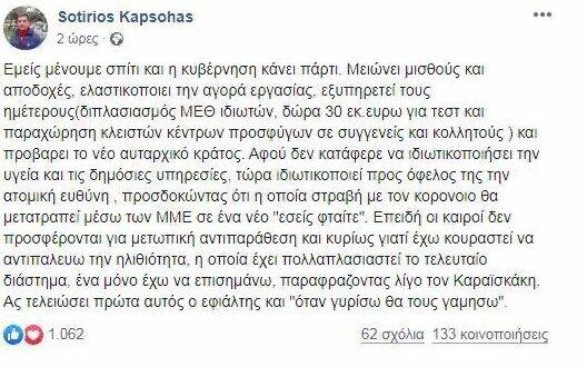 Στην συνέχεια και προφανώς από τα πολλά σχόλια που δέχτηκε ο κ. Καψώχας κατέβασε την ανάρτηση και ανέβασε μια άλλη στην οποία γράφει: