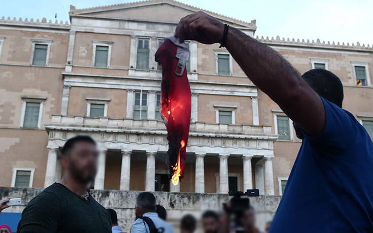 Μικρή ομάδα συγκεντρωμένων έκαψε τουρκική σημαία μπροστά στη Βουλή με αποτέλεσμα να αποδοκιμαστούν από άλλους παρευρισκόμενους.Κάποιοι προσπάθησαν να τους αποτρέψουν σε συνέπεια να υπάρξει ένταση.