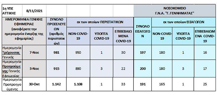 "Το σύνολο των εισαγωγών Covid - non Covid περιστατικών παρουσιάζει σταθερότητα, συγκριτικά με την προηγούμενη ημερομηνία εφημέρευσης, ενώ ειδικά τα περιστατικά Covid εμφανίζονται μειωμένα (16 έναντι 25 στις 30 Οκτωβρίου).